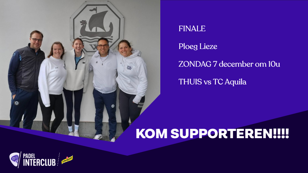 Onze interclubploeg gemengd P300, ploeg Lieze, speelt zondag 7 december om 10u thuis de finale van de eindronde tegen TC Aquila uit Wingene.